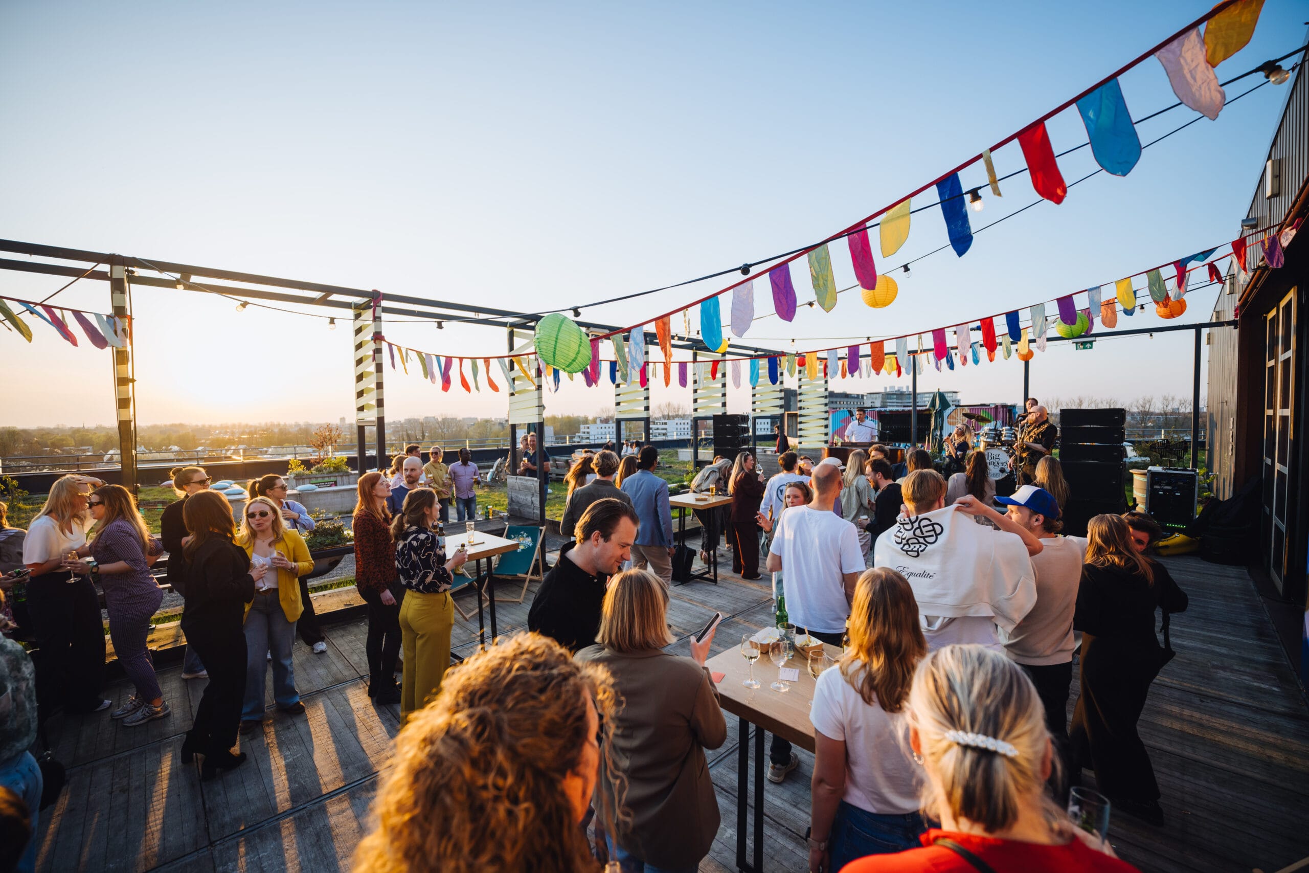 Deze rooftop bar is volledig flexibel inzetbaar voor borrels, diners en (bedrijfs)feesten, met uitzicht over de stad. In de zomer kunnen de grote deuren open en wordt ook de daktuin onderdeel van jouw event.